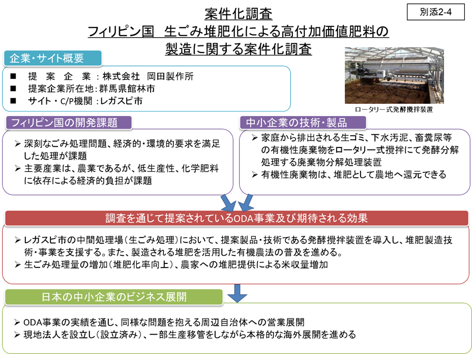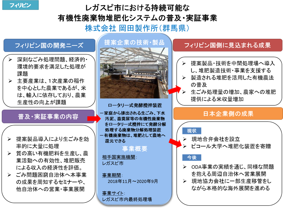 フィリピンのアルバイ州レガスピ市にある国立ビコール大学と堆肥化共同研究を行い、フィリピンの生ごみ問題に取り組むことを目的として現地法人を設立しました。